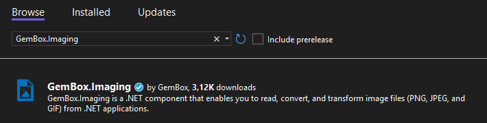 GemBox.Imaging is a .NET component that enables you to read, convert, and transform image files (PNG, JPEG, and GIF) from .NET applications. GemBox.Imaging requires only .NET. It supports a wide range of .NET versions, as listed below: Before you can use GemBox.Imaging, you need to install it in your project. The best way is by adding a GemBox.Imaging NuGet package via NuGet Package Manager in Visual Studio. To install the package, you can follow the steps listed below. However, please note that this guide assumes you have already set up a Visual Studio project. If you haven't done that yet, you can refer to the official tutorial for guidance. As an alternative, you can open the NuGet Package Manager Console (Tools -> NuGet Package Manager -> Package Manager Console) and run the following command: We also provide DLL and setup files on GemBox.Imaging's Downloads page. A link for the latest setup file is located at the bottom of the page, under the 'Global Assembly' section. Once you have installed GemBox.Imaging, all you have to do is add the using directive and make sure you call the The ComponentInfo.SetLicense requires a license key as a parameter. If you are using the component in a Free mode, use "FREE-LIMITED-KEY" as a license key, and if you have purchased a Professional license, use the key you got in your email after the purchase. You can read more about GemBox.Imaging's working modes on the Evaluation and Licensing page. After that, you can write your application code for working with images, like the code below. It shows how to load an Click the 'Run Example' button to run the code and download the resulting file. You can change the input picture by selecting it from the 'Input file name' dropdown control, or change the output format by selecting a corresponding file type from the 'Output file type' dropdown control. You can also upload your own image by dropping it on the 'Upload your file' area.Requirements