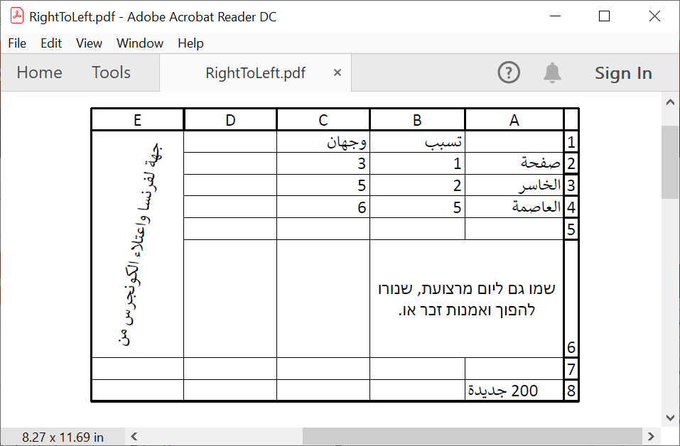 The following example shows how you can convert an Excel workbook with right-to-left text to PDF and other supported file formats, using the GemBox.Spreadsheet component in C# and VB.NET.